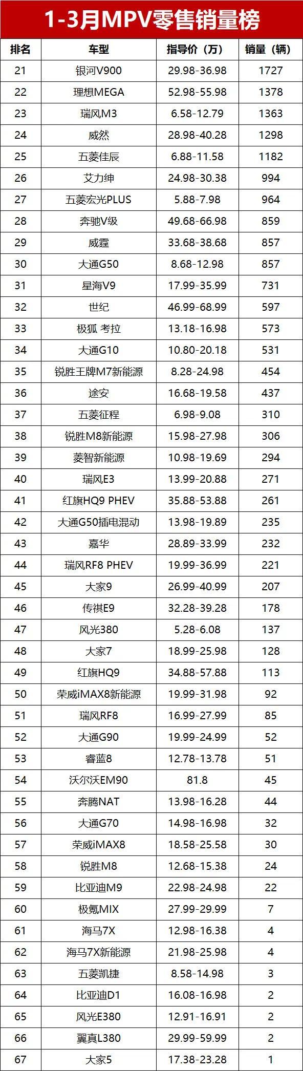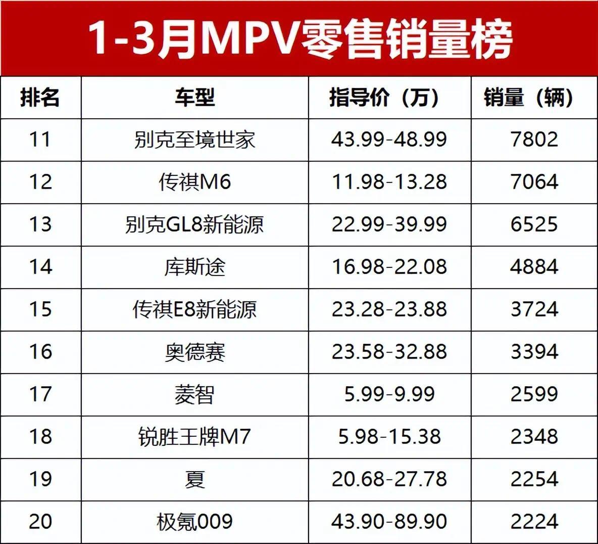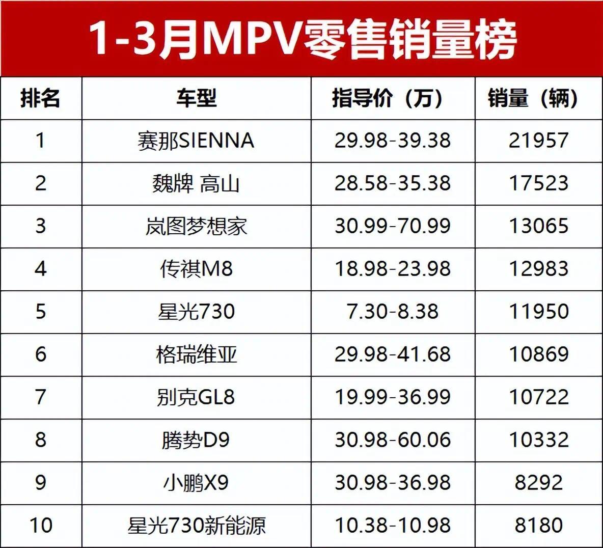 【2026年一季度MPV零售销量排行榜】受新能源优惠政策退坡、成品油涨价等多重因素影响,今年1-3月国内MPV市场表现平淡,乘联会数据显示,一季度MPV市场零售销量仅21.2万辆,同比减少8.6%。不过值得一提的是,这个跌幅远低于轿车细分市场的-27.8%,算是在整体疲软的车市中守住了阵地。高端MPV表现强势,包揽榜单前三位;新能源MPV虽有波动,但仍占据半壁江山;廉价代步MPV也有亮眼表现,多款车型跻身前十,67款车型同台竞技,有人欢喜有人愁!