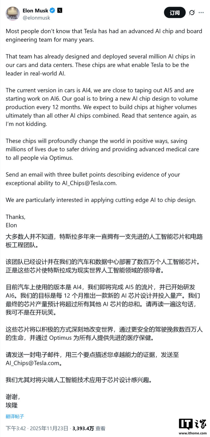 马斯克在推文中指出,许多人并不知道特斯拉已拥有一支先进的AI芯片及电路板工程团队多年,该团队已设计并部署了数百万颗用于特斯拉汽车和数据中心的AI芯片,这些芯片是特斯拉成为真实世界AI领导者的基础。IT之家附上相关截图如下: